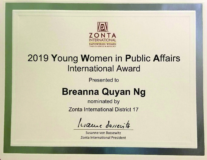 Breanna Ng, Z Club Chairman of Good Hope School (2018-2019) was the District 17 Winner and International Recipient of the Young Women in Public Affairs Award.